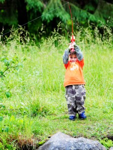Gabriel Thompson, 3, of Lewiston, struggles to untangle his line from a bush while fishing with his dad, Brian, on Wednesday at The Basin near Lake Auburn. “I don’t put a hook on,” said Brian. “He just likes to cast.” The duo caught a small bass before getting rained out.