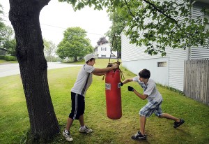 Ryan Lavoie, 15, holds a punching bag for Erik Wilson, 14, outside Wilson’s home on Mitchell Street in Lewiston on Tuesday. Wilson is using the bag to get in shape, said the Lewiston High School sophomore.