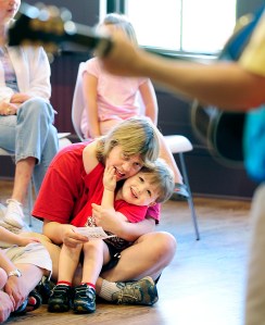 Jessica Walling and her son, Aiden, 3, of Lewiston, sing along with Marcus Gale’s “Summer Song” at the Lewiston Public Library on Thursday. Gale is a children’s entertainer from North Berwick who performs around New England.