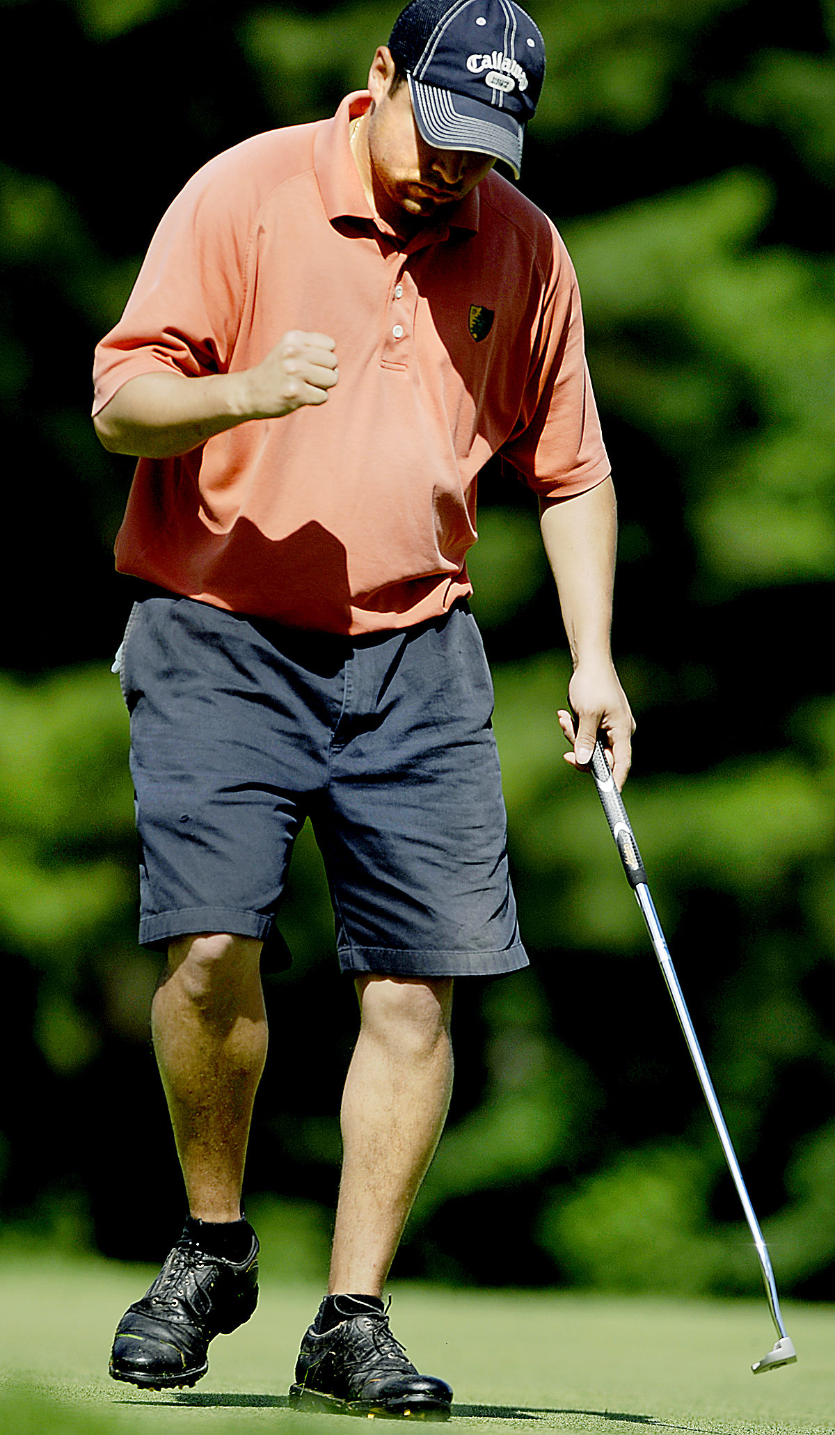 Joe Alvarez pumps his fist after sinking a putt on the seventh hole during the second round of the Maine Amateur Golf Championship at Martindale Country Club in Auburn on Thursday.