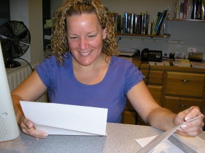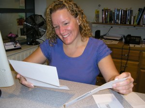 Melanie Coombs, librarian for the Farmington Public Library, looks over a grant check received Thursday … almost a year late.