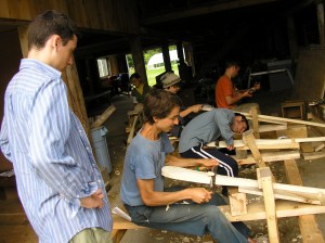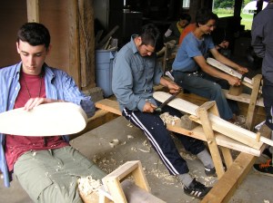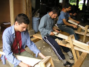Eleven students from various states are learning how to make paddles before using their craft on a canoe trip along the coast of Maine. Above, Chris Knapp of Koviashuvik Local Living School in Temple, who leads student expeditions for Kroka Expeditions out of Marlow, N.H., shows Conor Leary of Pennsylvania (standing) how to shave the bluntly cut wood into paddles at a farm on Owen Mann Road in Farmington on Tuesday. On a 14-day expedition, the group will spend three days at the school making paddles, then will travel to Blue Hill Bay to tour the smaller islands in large wooden canoes built by Kroka’s full-time students, Knapp said. The students sit on hand-built shave horses and hold the paddles tight, using wooden clamps held by their feet while they shave the wood.