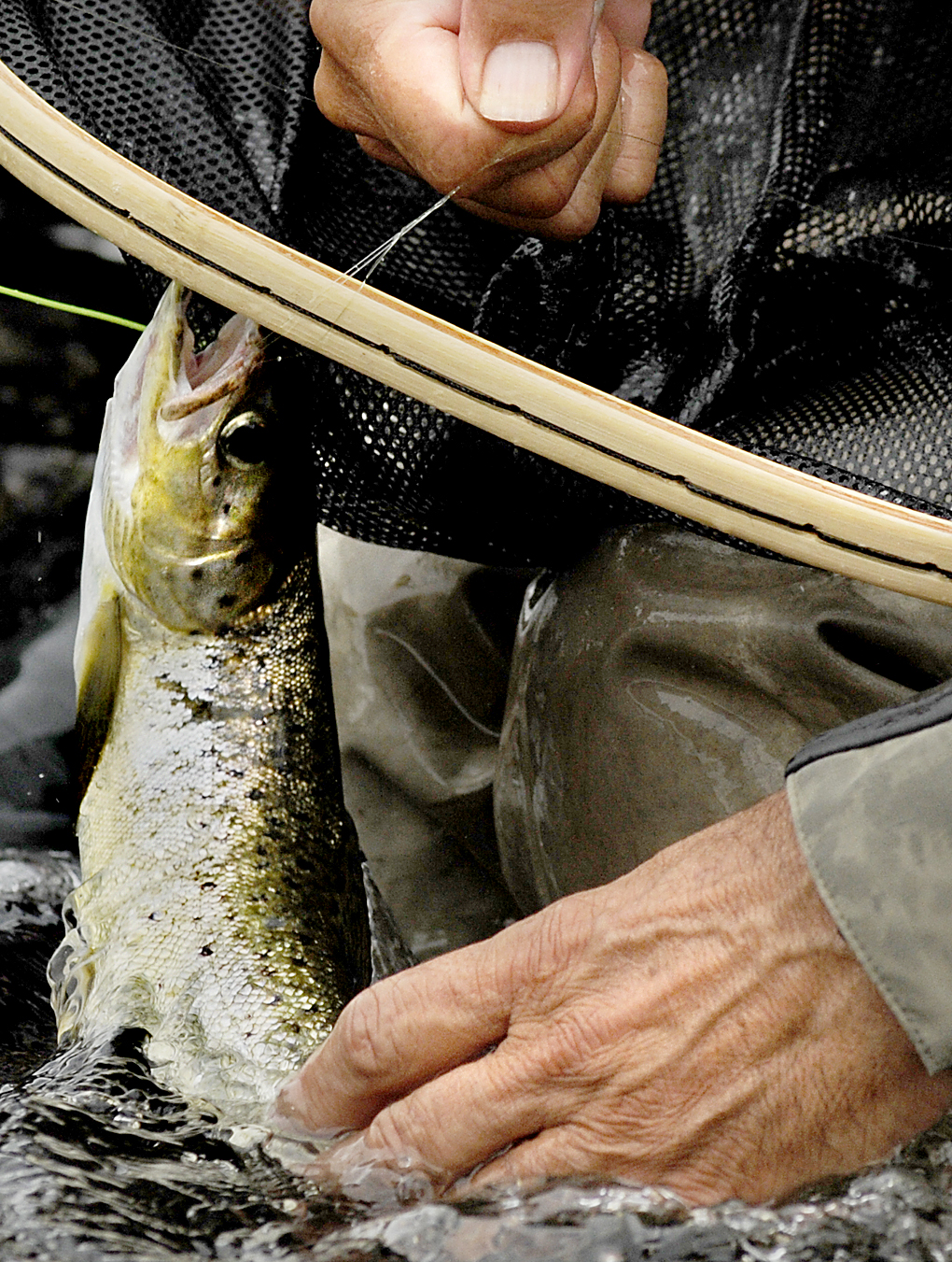 A volunteer guide lands a trout for a disabled vet on the Rapid River during “Project Healing Waters.”