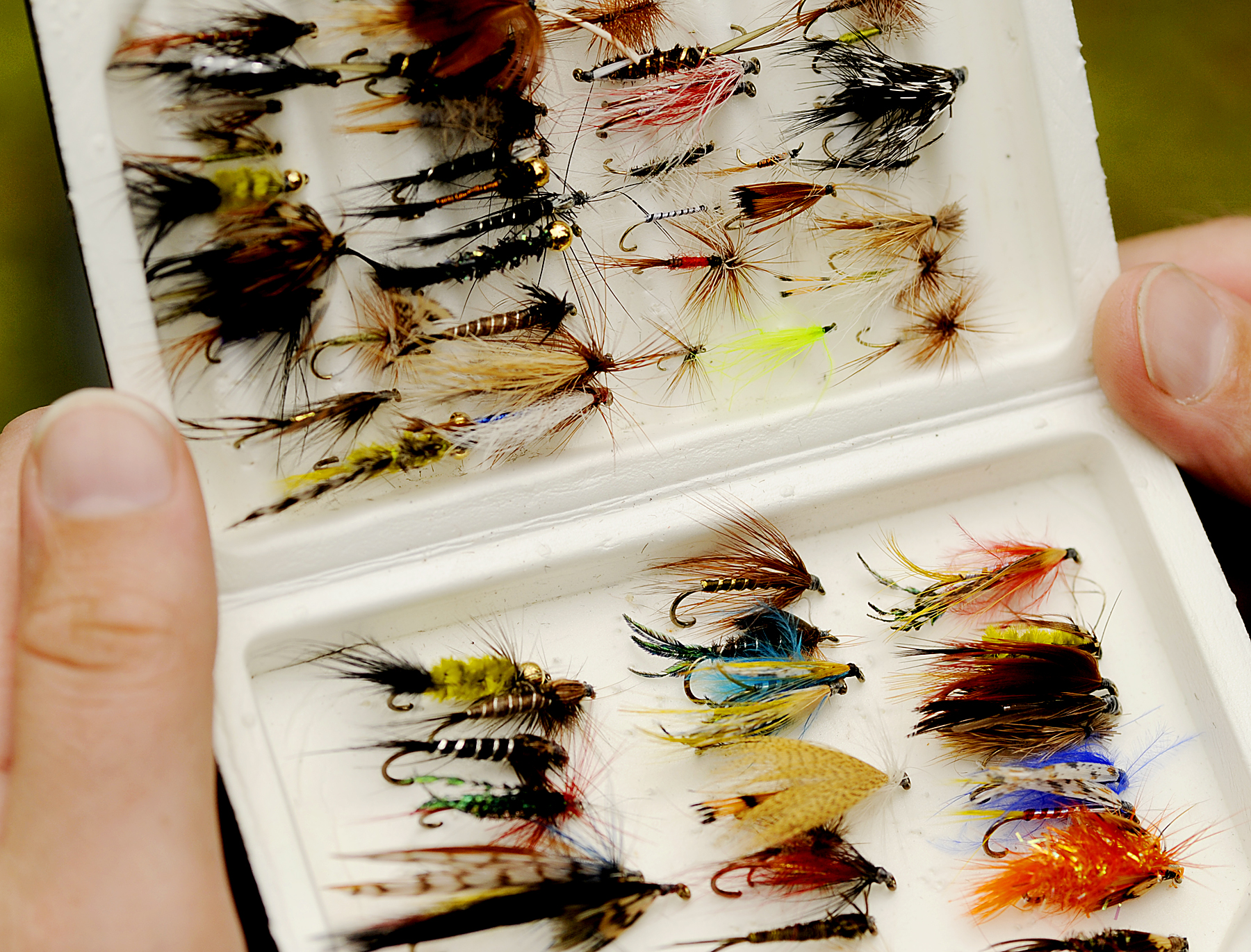Dave Walker looks over the flies that he tied himself. “It’s good therapy for my brain,” said Walker about hand tying trout and salmon flies. Walker has a brain injury from a roadside bomb that he encountered while serving in Iraq. One of Walker’s flies is named “Kelly” after his wife.