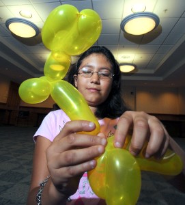 Maggie Elwell, 9, of Auburn, works on her balloon dog, Princess, at the Auburn Public Library on Thursday morning. The class was taking a break during a juggling workshop.