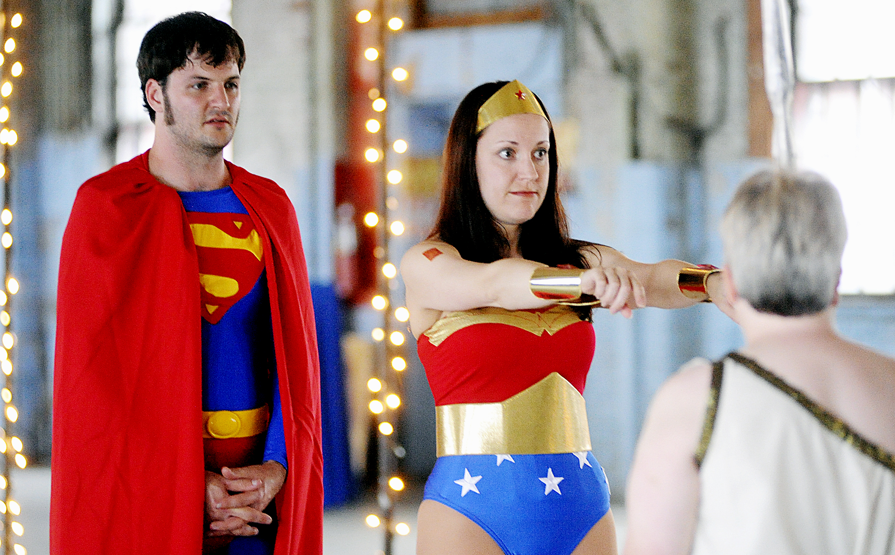 “We’re really doing this!” says Sarah LaFore, dressed as Wonder Woman, to her groom-to-be Superman, a.k.a, Tony Lucchese, after donning her costume for the rehearsal at a rented warehouse in Portland. They are to be married today in their “three-act Super Wedding.”