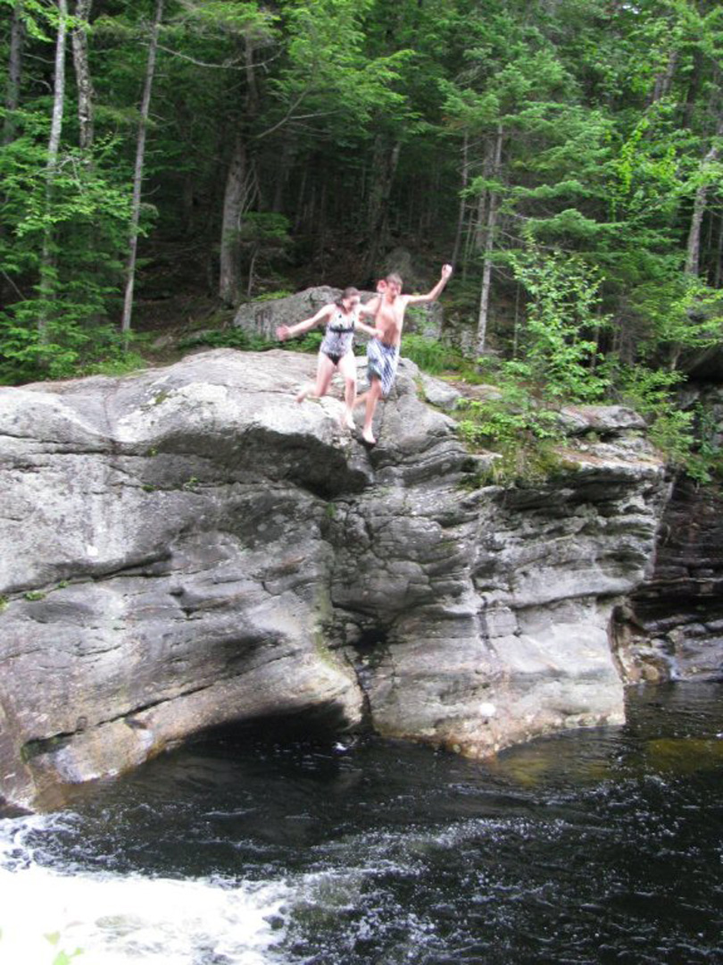 Woolen Mill Hole, off of Route 142 between Salem and Phillips has many rocky spots for jumping into the Sandy River.