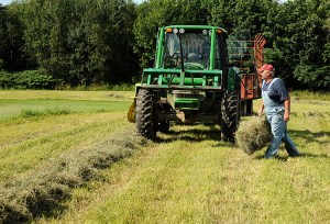 Jay Roebuck of the Roebuck Farm in Turner loads stray bales of hay onto his tractor on Saturday. Roebuck was taking advantage of the warm weather to catch up on haying. "We are way behind in our hay harvest this year, but so is every farmer in the Northeast," he said. "The rain has affected us a lot, but farmers accept whatever mother nature deals us."