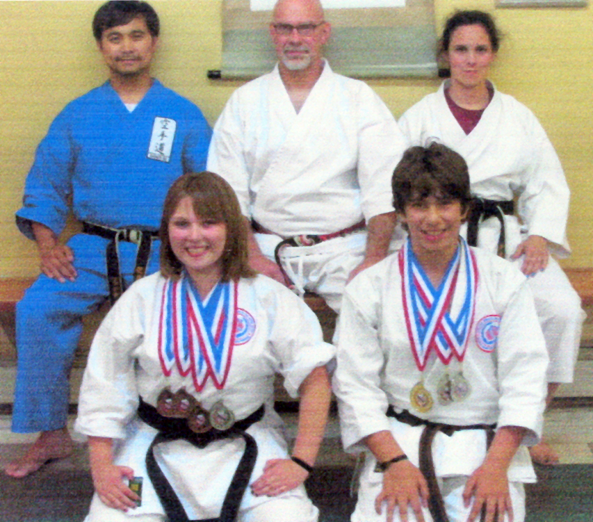 Members of Pelletier’s Karate Academy in Lewiston shined in AAU national competitions this summer. Kayla Provencher, front left, competed in the 14-year-old advanced division at the AAU Karate National Championships in Fort Lauderdale, Fla., in June. She brought home a silver medal in long weapons and a bronze medal in short weapons. Provencher also competed in the AAU Jr. Olympics in Des Moines, Iowa, winning bronze medals in kata and weapons. Also competing in Iowa was Mykul Rojas, right, in the 12-year-old beginner/novice division. Rojas won a gold medal in sparring, a silver medal in weapons and a silver medal in kata. Provencher has competed at the national level for eight years. This was Rojas’ debut at a national competition. Instructors, picture left to right in back, are Sensei Ferdinand Torres, Shihan Rich Pelletier and Sensei Sadie Landry.