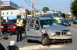 Jose Leiva/Sun Journal A Lewiston police officer investigates an accident involving three cars on Sabattus Street Lewiston at about 5:00 pm Thursday.