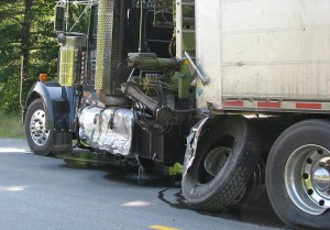 Diesel fuel streams out of a ruptured fuel tank Thursday afternoon on this B. D. S. Waste Disposal Inc. Kenworth tractor-trailer out of Corinna, after a Chevy sedan collided with the fuel tank and front dual wheels of the trailer on Route 2 in Wilton.