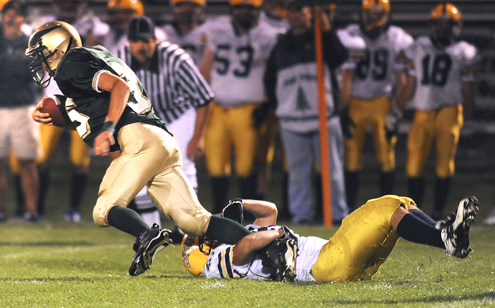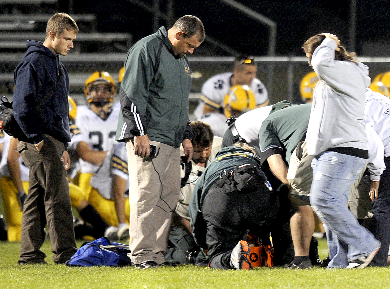 During the next Mt. Blue drive, on the first play from scrimmage, the Vikings’ faithful held their collective breath as junior Dan Taylor went for a tackle on a run around the right end and fell to the turf. He lay motionless for several minutes and was finally hoisted on a backboard onto a waiting stretcher, still in his full gear.