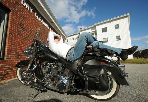 Lisa Meadows of Normandy, Tenn., relaxes on her Harley-Davidson motorcycle as she waits for laundry to finish at the L/A Clean and Spin on Tuesday. Meadows, a tax advisor by profession, is visiting a friend in Auburn as she tours the Northeast. After leaving Maine she plans to go to Niagara Falls, N.Y., but must first wait for her coat to arrive by overnight mail from Tennessee.