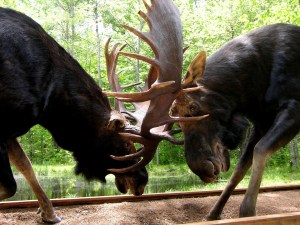 • Cheers to L.L. Bean, the state and the taxidermist extraordinaire Mark Dufresne of Gray for combining to create the unique, and incredibly compelling, exhibit of clashing bull moose being unveiled today in Freeport. The interlocked antlers are real (attached to replica moose), found in the woods of New Sweden, when they were attached to the bodies of their original owners, who died in battle.