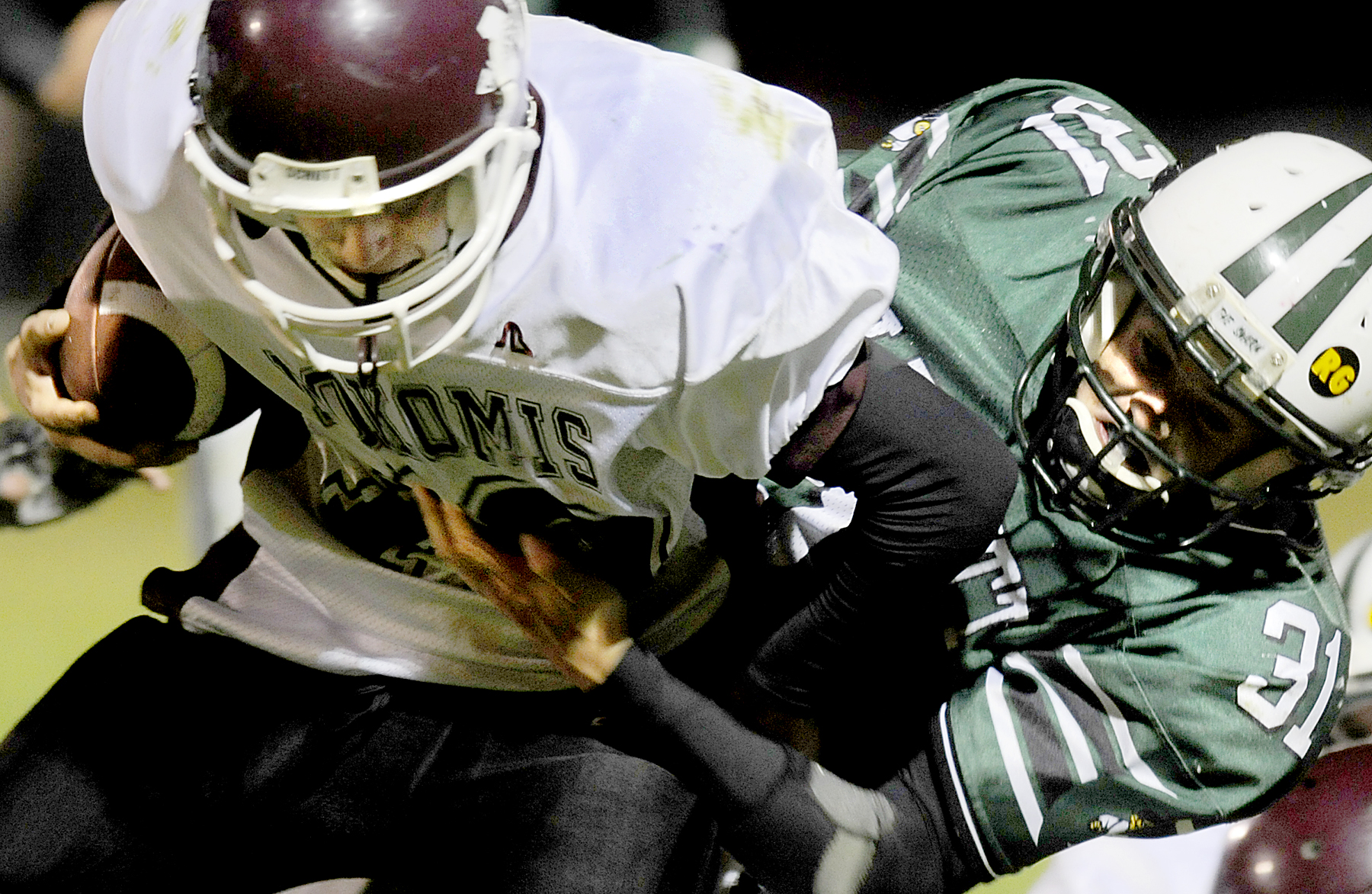 Jordan Hersom caught Theiss’ next pass in the left flat and raced up the sidelines for a 53-yard score to make it 13-0. Nokomis (1-2) actually had Leavitt stopped on its next series and forced the Hornets to punt, but an unsportsmanlike conduct penalty by the Warriors kept the drive alive. They had another 15-yard penalty tacked onto the end of the next play and three plays later, Theiss ran it in from a yard out.