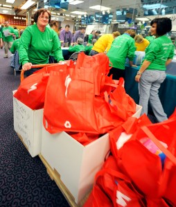 Terry Carpentier of Lewiston, a volunteer for the Dempsey Challenge wheels in bags filled with “goodies” that were given out to participants in the Dempsey Challenge when they picked up their bib numbers at the Auburn Mall Friday evening. The bags were filled with various items donated by area businesses for those participating in Sunday’s event.