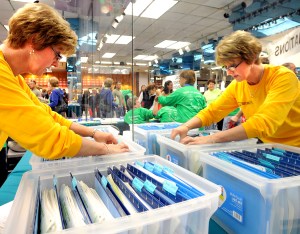 Mindi Strout of Brunswick, a volunteer for the Dempsey Challenge, searches for bib numbers of participants in Sunday’s Dempsey Challenge at the Auburn Mall Friday afternoon as they picked up their packets and bib numbers.