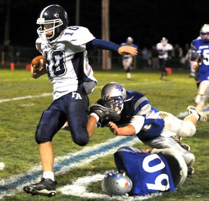 Fryeburg has two excellent weapons in Stefano and Conor Tweedie (51 yards rushing) and utilized the tandem, well. Stefano (71 yards,14 rushes) benefited from his running from the shotgun. But Stefano (seven of 14 for 83 yards) was intercepted twice by Cole Clark.