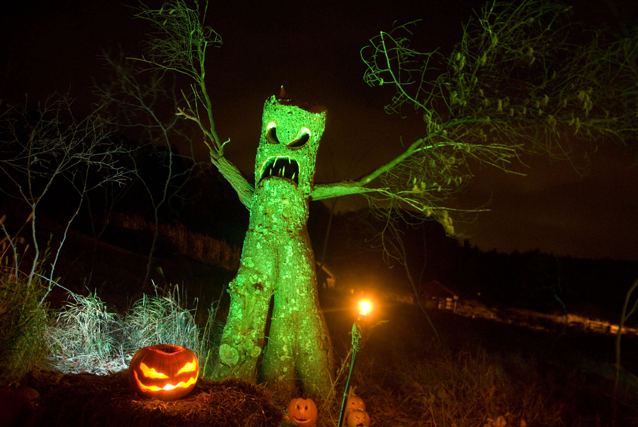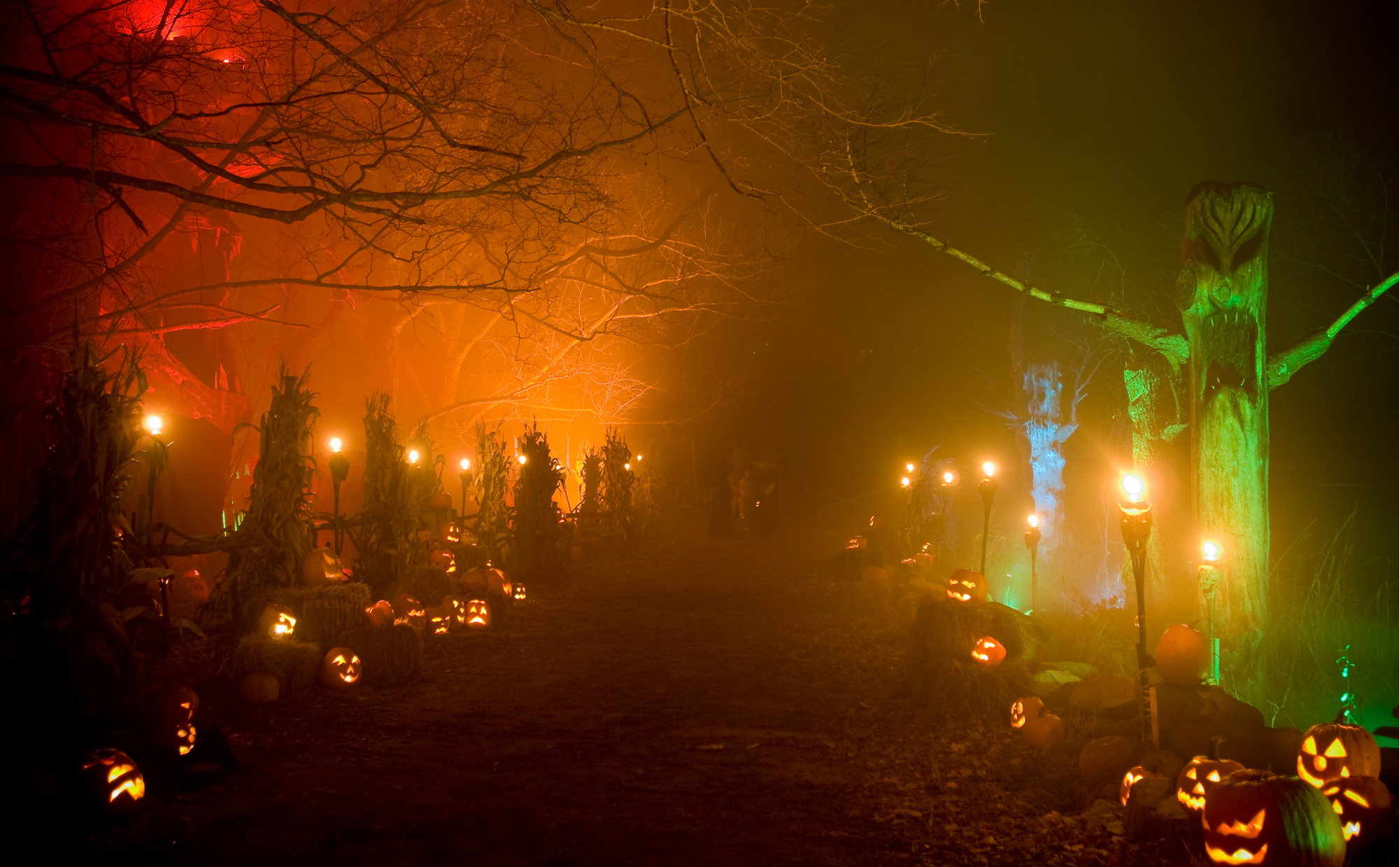 There’s a headless horseman roaming on a horse that’s real, but somehow too large to be believed. There are finely detailed pumpkin men, some towering as high as 35 feet. There are grim reapers and witches and, yes, freaks with chain saws who will sneak up behind you in the dark and fog.
