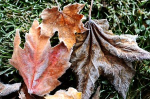 Maple leaves covered with frost lie on the ground Thursday morning after the temperature dipped below the freezing mark overnight.