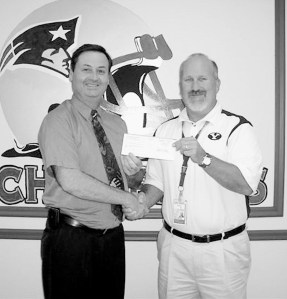 The Wal-Mart Distribution Center recently donated $1000 to the City Of Auburn Parks and Recreation Department. The money will be allocated to low income families for recreation programs. Pictured are Wal-Mart Operations Manager Mark Farnsworth and Peter Bushway, director of the Auburn Parks and Recreation Department.