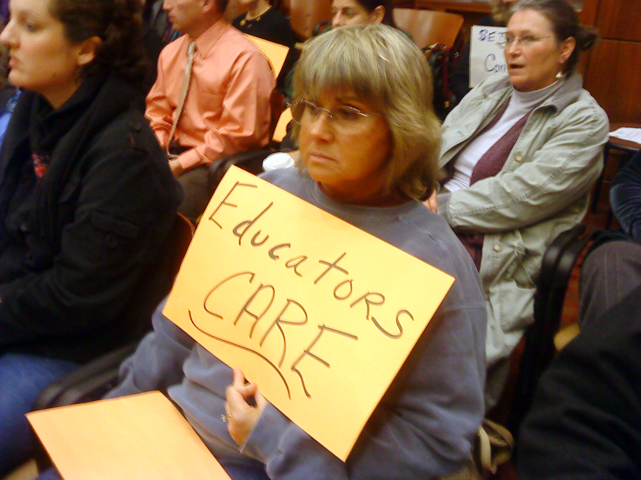 It was standing-room only as the teachers filled the meeting room. Outside the room, union President Timothy Wegmann explained why teachers were there.