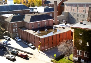 A workman on a ladder prepares the old Androscoggin County Jail on Turner Street in Auburn for demolition on Monday. The old jail is located between the Androscoggin Superior Court building on the left and the YMCA on the right.