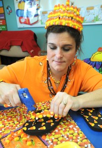 Minot Consolidated School teacher Wendy Simard, wearing a candy corn tiara, finishes gluing candy corn to a pair of shower shoes Friday. Simard spearheaded the observance of National Candy Corn Day for students to enjoy as an alternative to Halloween parties. Everything is candy corn today from shoes to cup cakes, Simard said.