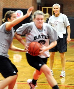 Jim Murphy works with his women’s basketball team at Bates before their first game on Friday night. Murphy lost only two seniors from a strong team last year, giving them hope of competing with Bowdoin, Amherst and the other perennial powers of its Division III conference.