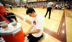 Auburn native Josh Titus fills paper cups with Gatorade, one of his duties as team manager of the Maine Red Claws, a new NBA D-League basketball team based in Portland. The team played an intrasquad game Thursday night at Edward Little High School in Auburn.