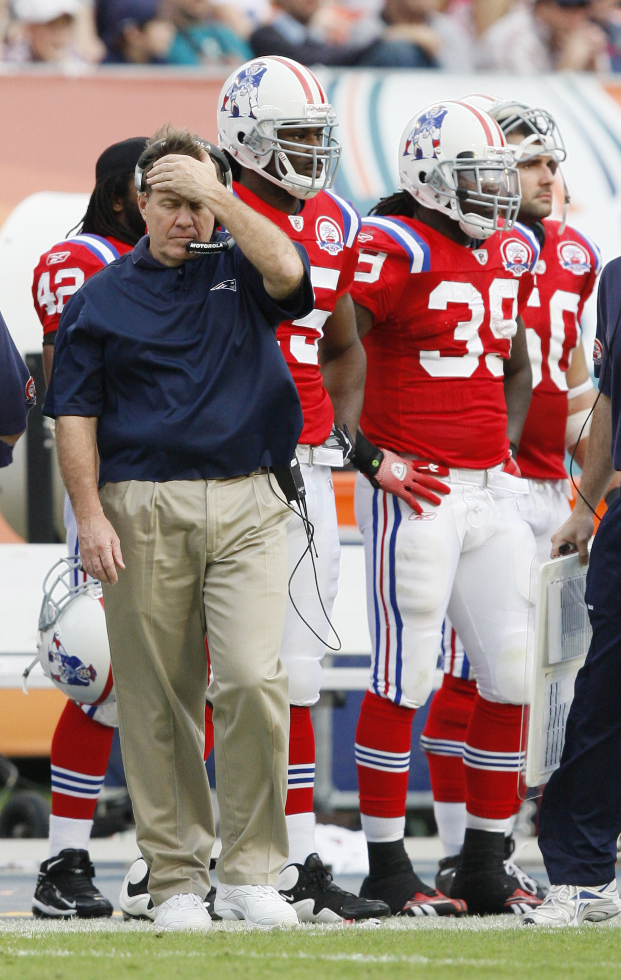 Leading 14-7 with a fourth-and-1 at the Miami 6-yard line with two minutes left in the first half, Belichick chose to go for it, but Sammy Morris was stopped for no gain. With the lead down to 21-19 and about 9 1/2 minutes left in the game, Brady’s pass to Randy Moss was intercepted in the end zone by Vontae Davis on a second-and-5 at the Miami 5.