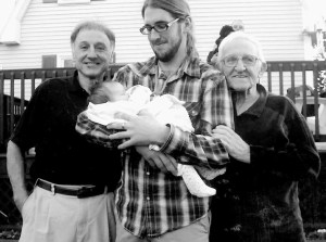 Matthew, Kristen and Mikela Hebert recently flew in from Whitefish, Mont., to visit family. A four generation photo was taken during the visit. Pictured from left are David Hebert of Rangeley, grandfather; Matthew Hebert, father, holding Mikela; and Maurice Hebert of Turner, great-grandfather.
