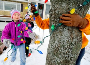 reaches to help her mother, Jen, with the Christmas lights at their home in
