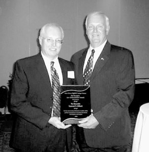 Lewiston Mayor Larry Gilbert was honored on Nov. 5, at the Maine Citizens Against Handgun Violence 10th anniversary dinner held at the Marriott Sable Oaks in South Portland. Gilbert was presented with the Ed Googins Law Enforcement Award for his work and commitment to keeping illegal handguns away from criminals, while preserving rights for those who lawfully own guns. Googins is currently Chief of Police in South Portland and is a member of the MCAHV board of directors. Googins, left, is pictured with Gilbert.