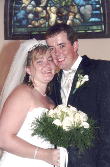 The bride, given in marriage by her father, wore a strapless white satin gown with lace appliques and sequins. She also wore a chapel length veil and carried a bouquet of Calla lilies and white roses. Pinned to the ribbon of her bouquet was a locket containing a picture of her late grandfather, Chris Murray.