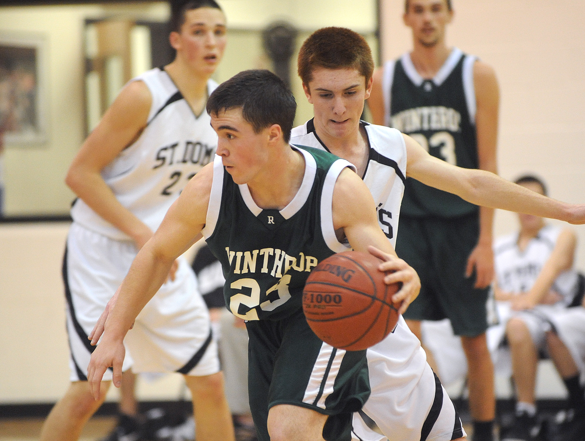 St. Dom’s Peter Keaney goes up for the shot past Winthrop defenders Billy Gordon, left, and Justin White in a basketball game played at St Dom’s on Monday