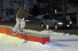 While Thursday night traffic slowly drives by, Trevor Stockdale of Rumford takes in a practice slide down a 22-foot-long rail built on a 150-foot-long snow course in the eastbound lane of Main Street in Bethel for Thursday night’s Lower Main Street Rail Jam.