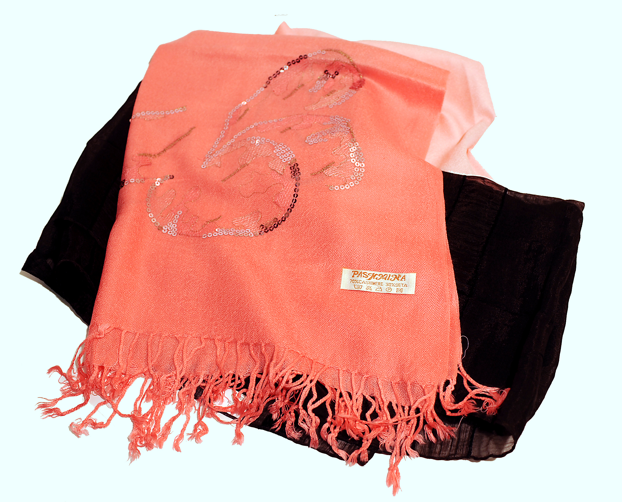 This scarf nearly ruined the entire shopping adventure by catching my eye early and forcing every scarf thereafter to measure up. The fringed ends start at a rosy pink and lighten to pale pink in the middle. Sequins and subtle gold thread lend a kick. The tag says 70 percent cashmere; for what it’s worth, according to Merriam-Webster, Pashmina is cashmere-like wool from a Himalayan goat.