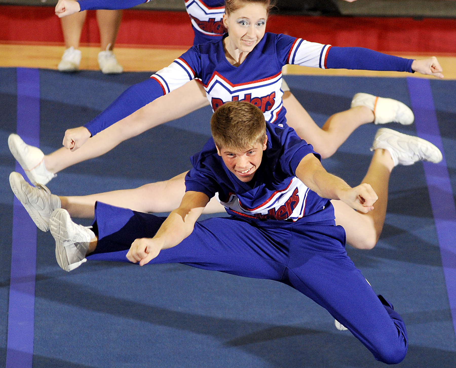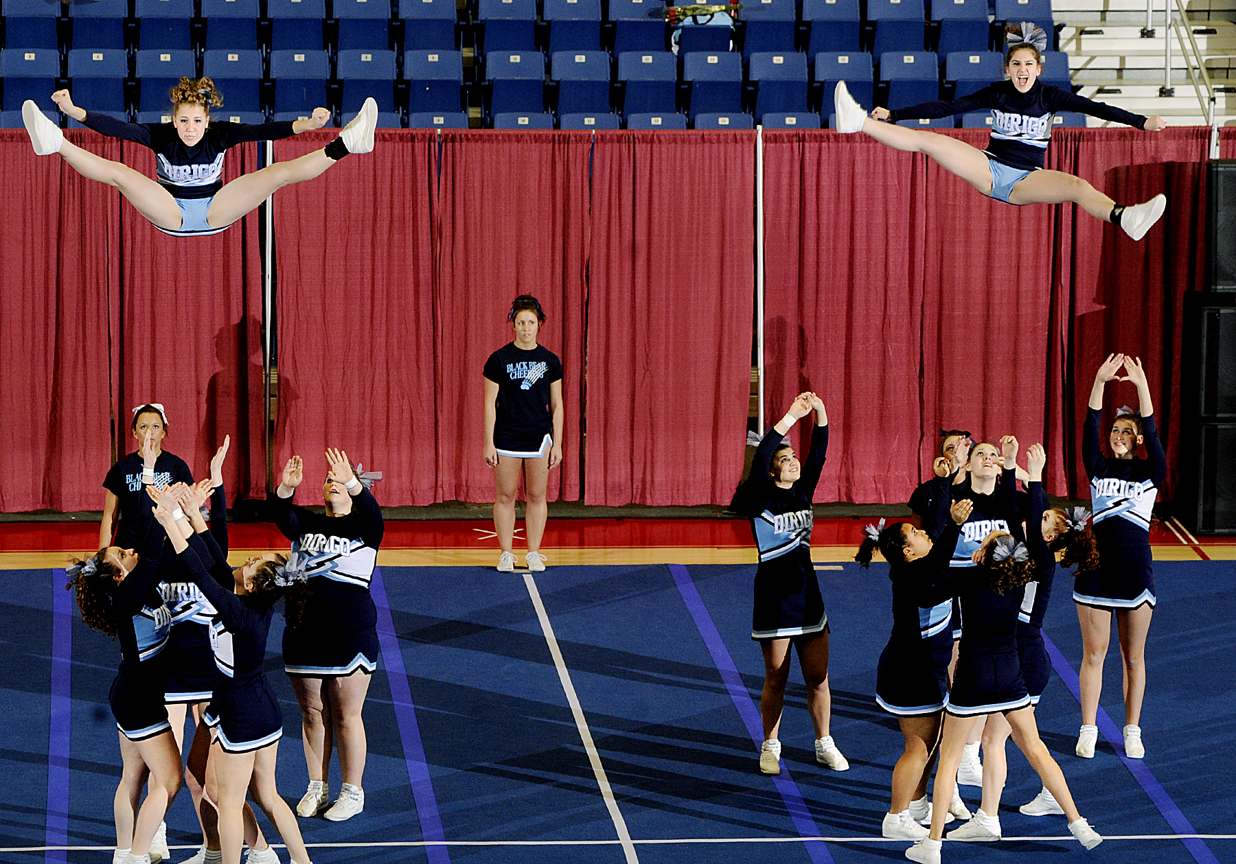 One of the Mustangs’ stunts ended with their base performer touching the floor, necessitating a deduction. The other miscue was a double twist in which the judges determined that Monmouth’s flyer landed prone upon her stomach.