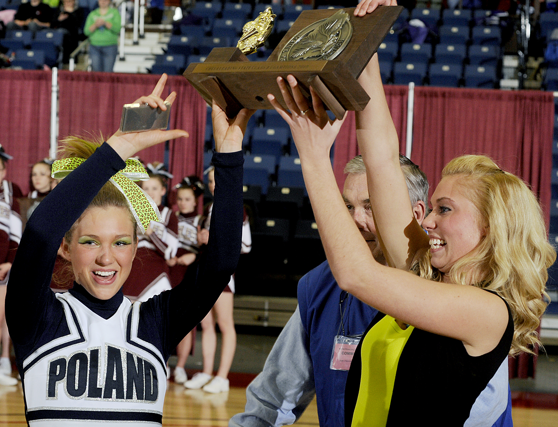 Already established as the only squad in school history to win a state title in any sport, Poland cheering claimed that Class B crown for the the second time in three years and third overall Saturday before a standing-room-only throng at Augusta Civic Center.
