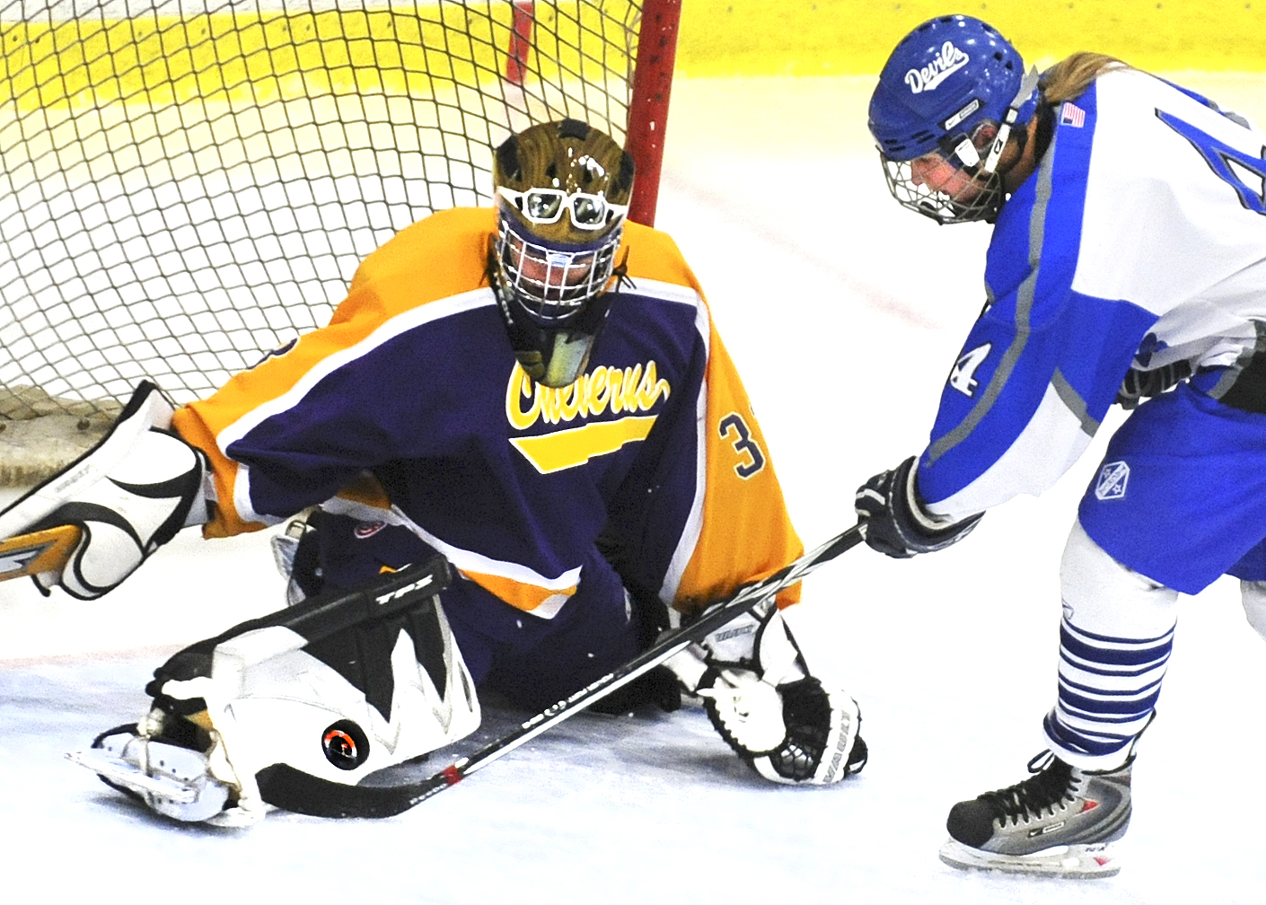 In the second, sniper Marisa Zamrock had the best chance for either side when she swung out wide left against the Cheverus defense. She cut back to the center and tried to deke around Lanouette, but she ran out of real estate and the puckstopped in the blue paint, just shy of the left post, where the quick-thinking Lanouette covered it up.