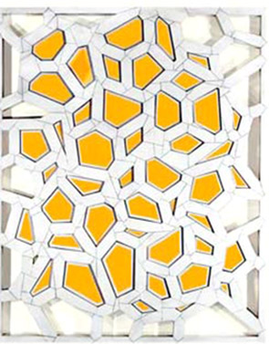 Lynch’s paintings evoke the type of order and chaos found in patterns of nature — branching, veining of leaves and molecular systems. He often begins a work by drawing a 120-degree line, and then continues to further divide the picture plane into hundreds of increasingly smaller shapes, each layered with variations in color, line and scale.