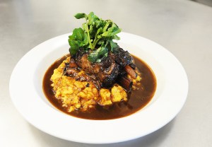 “This is a tough piece of meat — not something that you can just cook or grill off,” said Oliver. “It requires a couple hours cooking at a low temp in liquid. You’re looking to have it fall right off the bone when it’s done.”