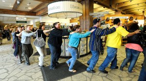 At L.L. Bean’s third floor café, participants blended in as shoppers until a concealed boom box began blasting Quad City DJ’s, “C’mon N’ Ride It (The Train),” the cue to form the conga line.