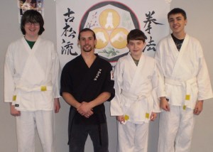 On Friday, March 26, 2010 three students at United Fitness & Martial Arts Studio in Livermore Falls tested for their next rank. This was the first test held at the Livermore Falls dojo, and after a grueling 90-minute examination, Andrew Bernier, Tyler Mills and Richard LaPointe successfully passed. Sensei Jaaron Shaw was impressed with all the students and said that he is proud to have students who have trained so hard. Pictured left to right are Bernier, Shaw, LaPointe and Mills.