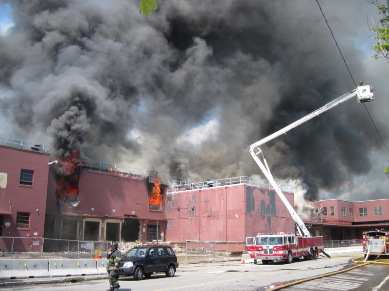 PORTLAND, Maine (AP) — The former Jordan’s Meats plant in Portland was gutted by a fire that sent billowing clouds of smoke over parts of the city as it was in the process of being demolished.