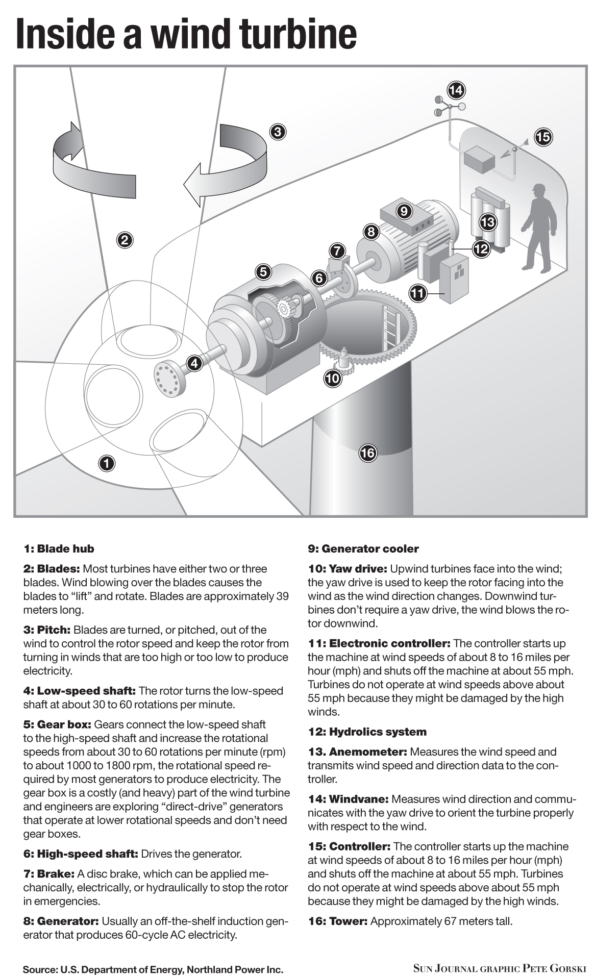 In all, 17 people work on the Northland farms, three for the company, including Hogan and Dufour and a front-office manager, the rest are full-time maintenance contractors for the turbine companies.