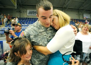 Donald Cleaves watched as his returning son, Kevin, hugged Kevin’s daughters, Cheyenne, 12, and Jacki, 15.