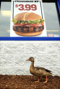 A mallard duck walks past a hamburger sign at the Burger King near the Auburn Walmart store Tuesday. A flock of mallards was hanging around the front door and flower beds of the fast-food burger chain.