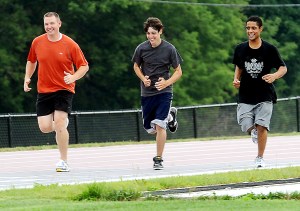 On a hot and muggy Thursday afternoon, Tyler Wildes, 18, of Auburn, and Josh Birkbeck, 15, of Lewiston, would probably rather be at the pool than running the Bates College track with Lewiston police Officer Craig Johnson.